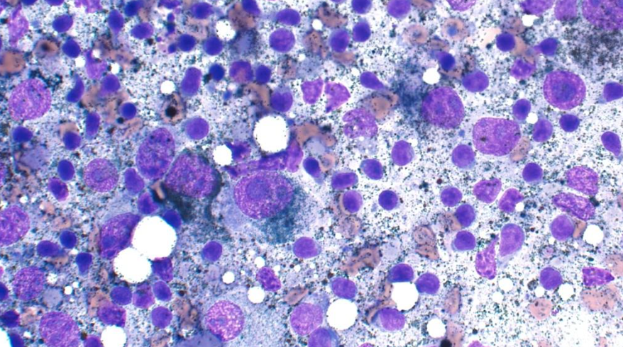 Individual cells with wispy borders and deeply basophilic (blue) cytoplasm.